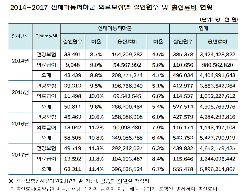 실제 심평원이 제출한 자료에 따르면 신체기능저하군에 해당하는 요양병원 입원환자 수가 2014년 4만3439명에서 2017년 6만3311명으로 크게 증가한 것으로 나타났으며, 이는 전체 환자 55만5478명의 11.4%를 차지한다.