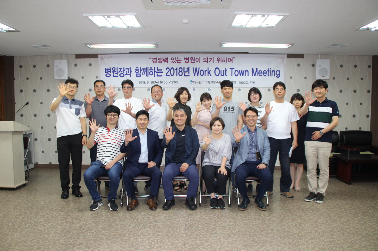 [한의신문=강환웅 기자] 대구한의대학교 부속 포항한방병원은 지난 28일 병원 세미나실에서 포스코 혁신리더 과정 이수자 및 병원 보직자를 대상으로 경쟁력 있는 병원이 되기 위해 각자의 역할 및 우리의 자세라는 주제로 '병원장과 함께 하는 워크 아웃 타운 미팅'을 실시했다.