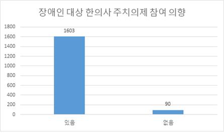 이를 세부적으로 살펴보면 '장애인 주치의제도에 대해 알고 있는지' 여부를 묻는 질문에 '아니오'가 1050명(62.0%), '예'가 643명(38.0%)으로 나타나 아직까지는 제도에 대해 모르는 경우가 많았지만, 향후 장애인 대상 한의사 주치의제도가 도입될 경우 참여할 의향이 있는지 묻는 질문에는 '있음'이 1603명(94.7%)으로 참여 의향이 월등히 높은 것으로 나타났다.