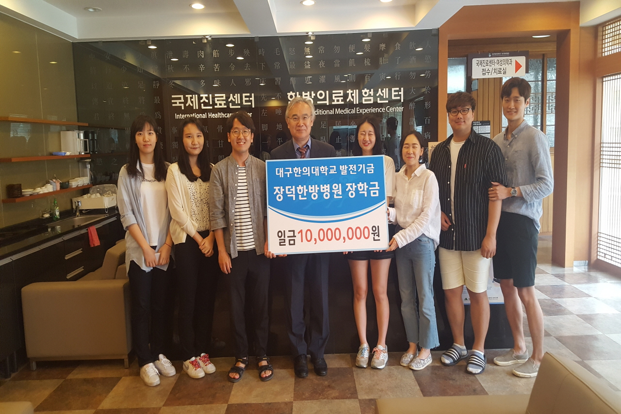 대구한의대학교(총장 변창훈) 한의학과 6기 졸업생인 장덕한방병원 신광순 원장이 지난 22일 총장실을 방문해 모교 발전과 한의학과 후배들의 학업 증진을 위해 발전기금 1,000만원을 전달했다.