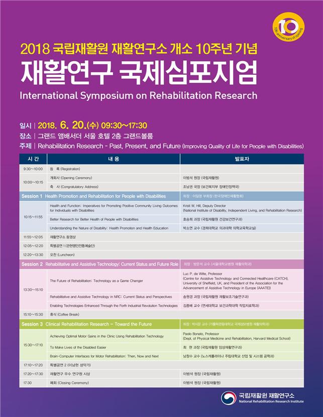 국립재활원 재활연구소(원장 이범석)는 개소 10주년을 기념하고 재활분야의 장애인 건강증진 및 재활기술개발 등 향후 재활연구소의 미래 사업과 비전을 제시하고자 20일 그랜드 앰배서더 서울호텔에서 ‘재활연구 - 과거, 현재, 그리고 미래(Rehabilitation Research - Past, Present, and Future)’를 주제로한 ‘제10회 2018 재활연구 국제심포지엄’을 개최했다.