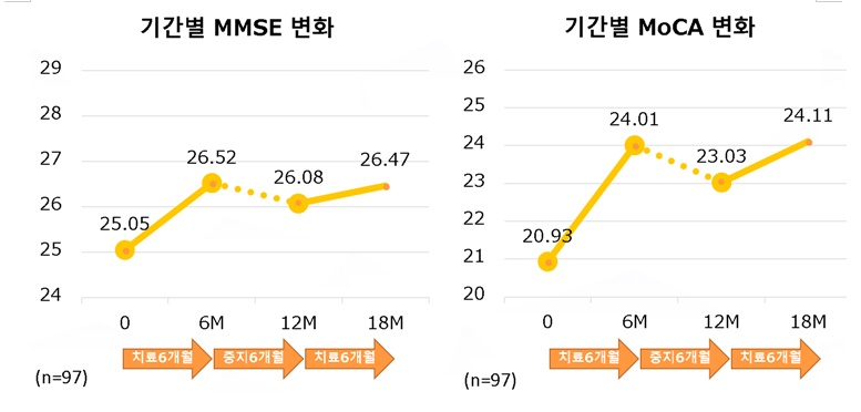즉 기존 환자군은 2016년의 치료 전·후에 있어 우선 MMSE 점수는 치료 6개월 전·후 25.05에서 26.52까지 상승했으며, 이후 중단 6개월 동안 26.08까지 하락했지만 2017년의 치료 재개 후에는 26.47까지 상승해 전체 치료기간 전·후로 MMSE 점수는 유의하게 상승했다.