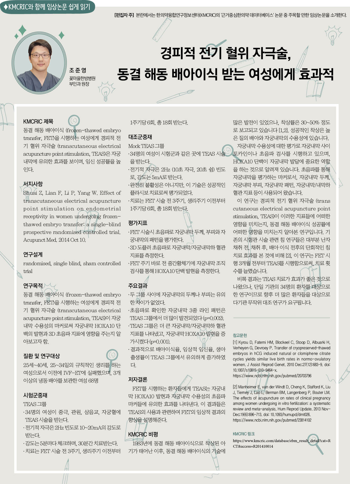 동결 해동 배아이식 (frozen-thawed embryo transfer, FET)을 시행하는 여성에게 경피적 전기 혈위 자극술 (transcutaneous electrical acupuncture point stimulation, TEAS)은 자궁내막에 유의한 효과를 보이며, 임신 성공률을 높인다.