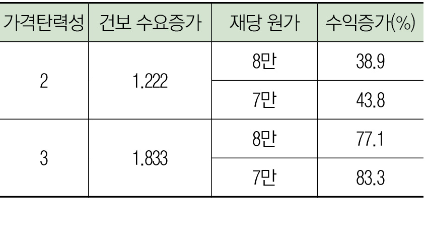 아래 표는 첩약의 가격탄력성을 2, 3으로 적용했을 때 한약 소비량의 증가와 그에 따른 경제효과를 계산한 것이다. 현재 치료적 목적의 첩약시장 규모를 9200억 정도로 추정할 수 있는데, 전체 상병으로 확대할 경우 2조~2조6000억, 일부 상병과 계층에만 한정할 경우, 1조3000억~1조4000천억 정도의 시장확대가 예측된다. 참고로 기존 첩약의 가격탄력성 연구결과는 5.8이었다.