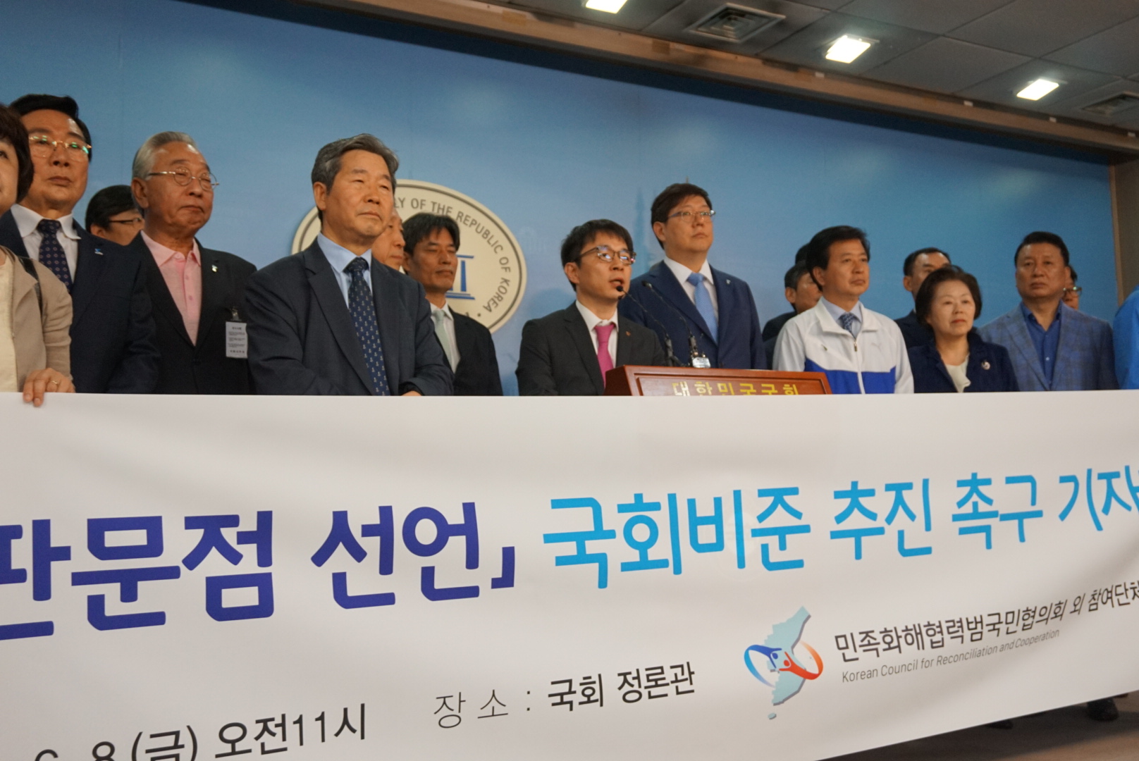 8일 국회 정론관에서 민화협 주최로 열린 ‘4·27 판문점 선언 국회 비준을 위한 기자회견’에서 노웅래 민화협 공동의장은 “민화협은 진보와 보수를 아우르는 사회 협의체로서 31개 시민단체가 이번에 뜻을 모았다”며 “정권이 바뀌더라도 부침없는 남북 간 항구적 평화체제 구축이라는 국민의 염원을 담아 국회는 조속히 비준해야 한다”고 목소리를 높였다.