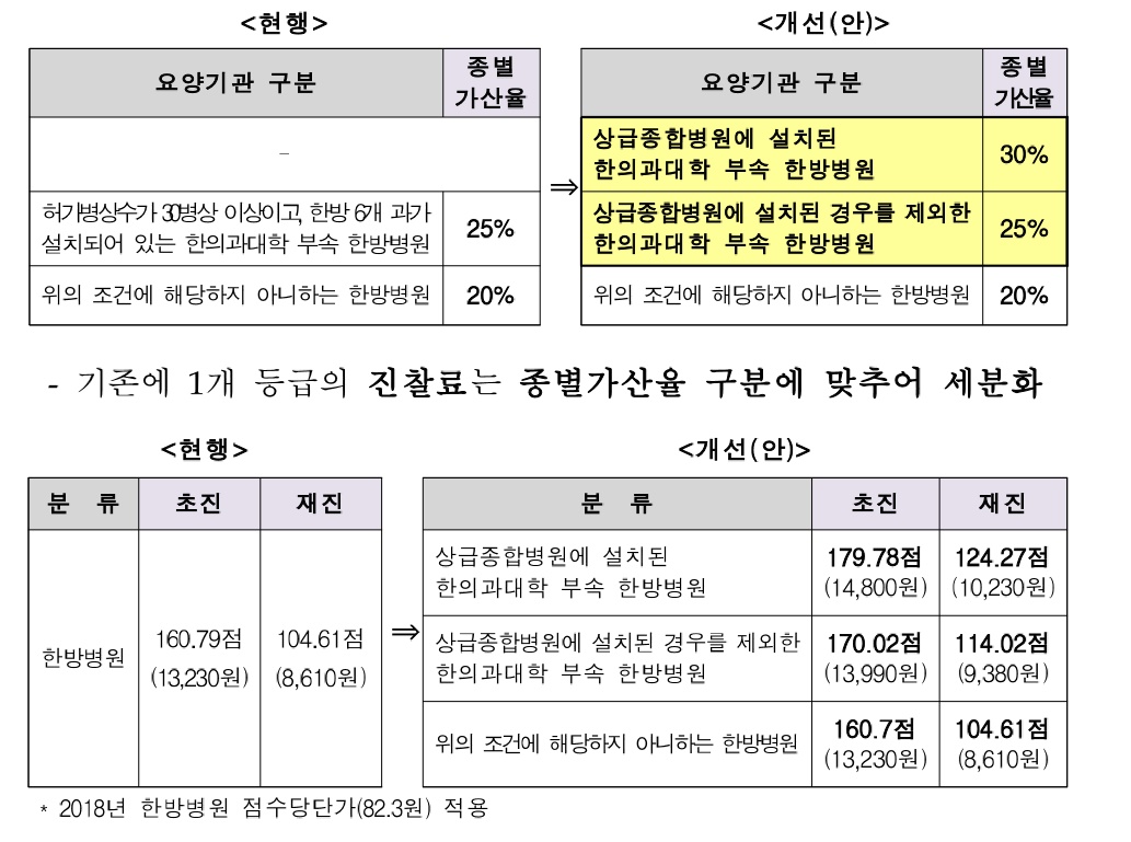 이에 따라 신설된 종별가산율의 경우 상급종합병원이 설치돼 있고, 일정 수준의 교육·의료 기능을 충족(의료법 시행규칙 제41조 제1항 제3호에 따른 8개 전문과목을 모두 설치한 경우)하는 한방병원에 대해서는 30% 가산을 신설·적용하는 한편 25% 기준은 신설 기준에 맞춰 정합성 있게 개선해 나갈 예정이다.