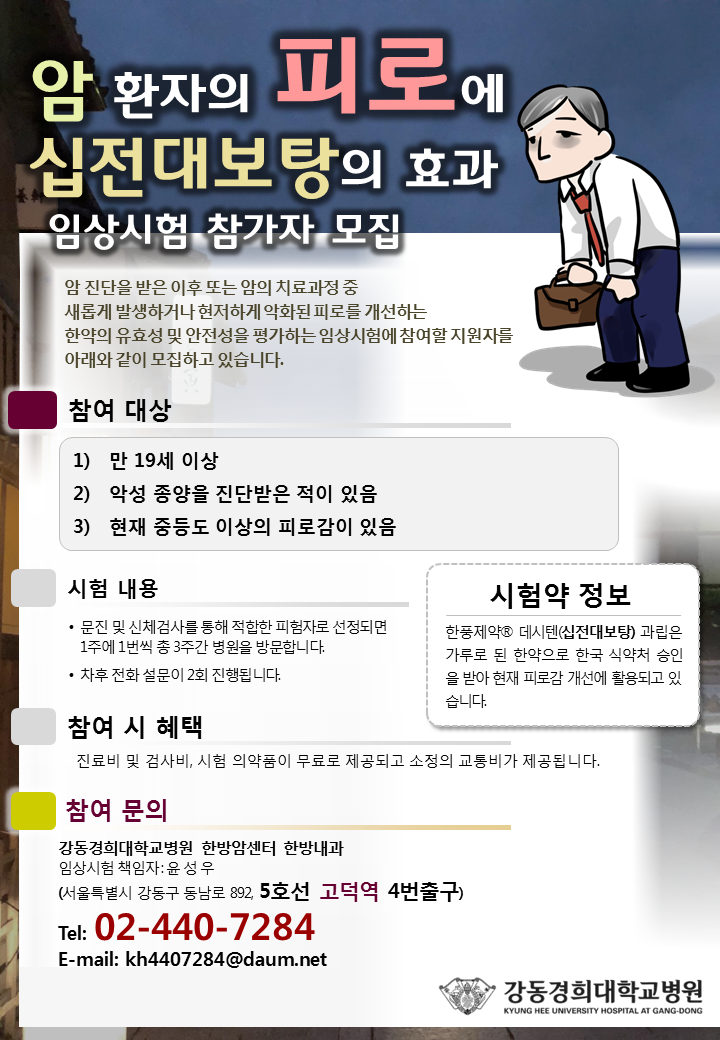 [한의신문=강환웅 기자] 강동경희대학교한방병원 한방암센터 윤성우 교수팀이 암환자의 피로에 대한 십전대보탕의 효과 연구를 위해 임상연구 참여자를 모집한다.