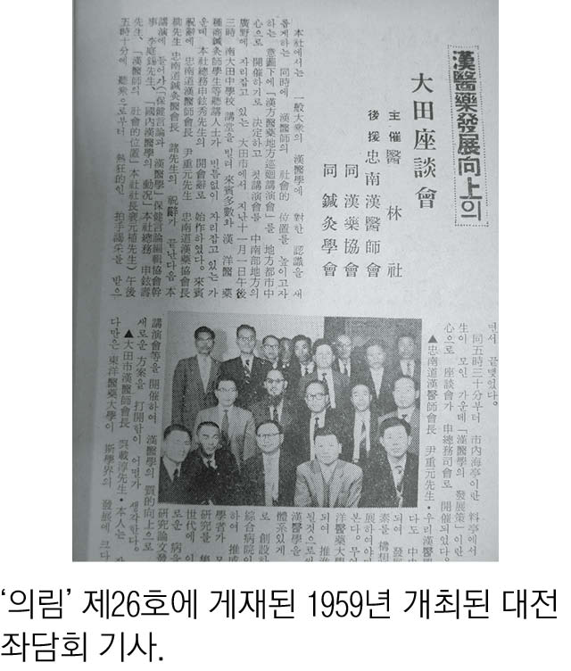 1959년 11월10일 오후 3시 대전시 남대전중학교 강당에서 한의학학술잡지 『醫林』 주최, 충청남도 한의사회·한약협회·침구학회의 후원으로 좌담회가 이뤄졌다.