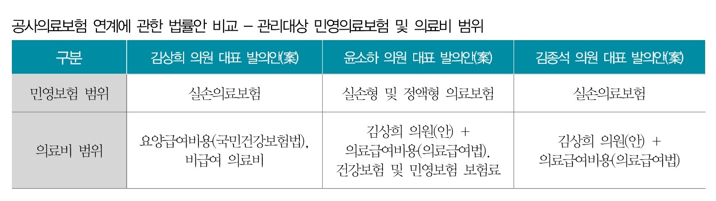 이들 법률안은 제정목적 및 공·사의료보험 연계관리에 대한 내용은 대동소이한 반면 공사의료보험 연계관리 대상이 되는 민영의료보험의 범위 및 의료비의 정의, 위원회의 구성 및 운영방식, 실태조사, 벌칙조항 등에 대해서는 다소 차이를 보이고 있다.