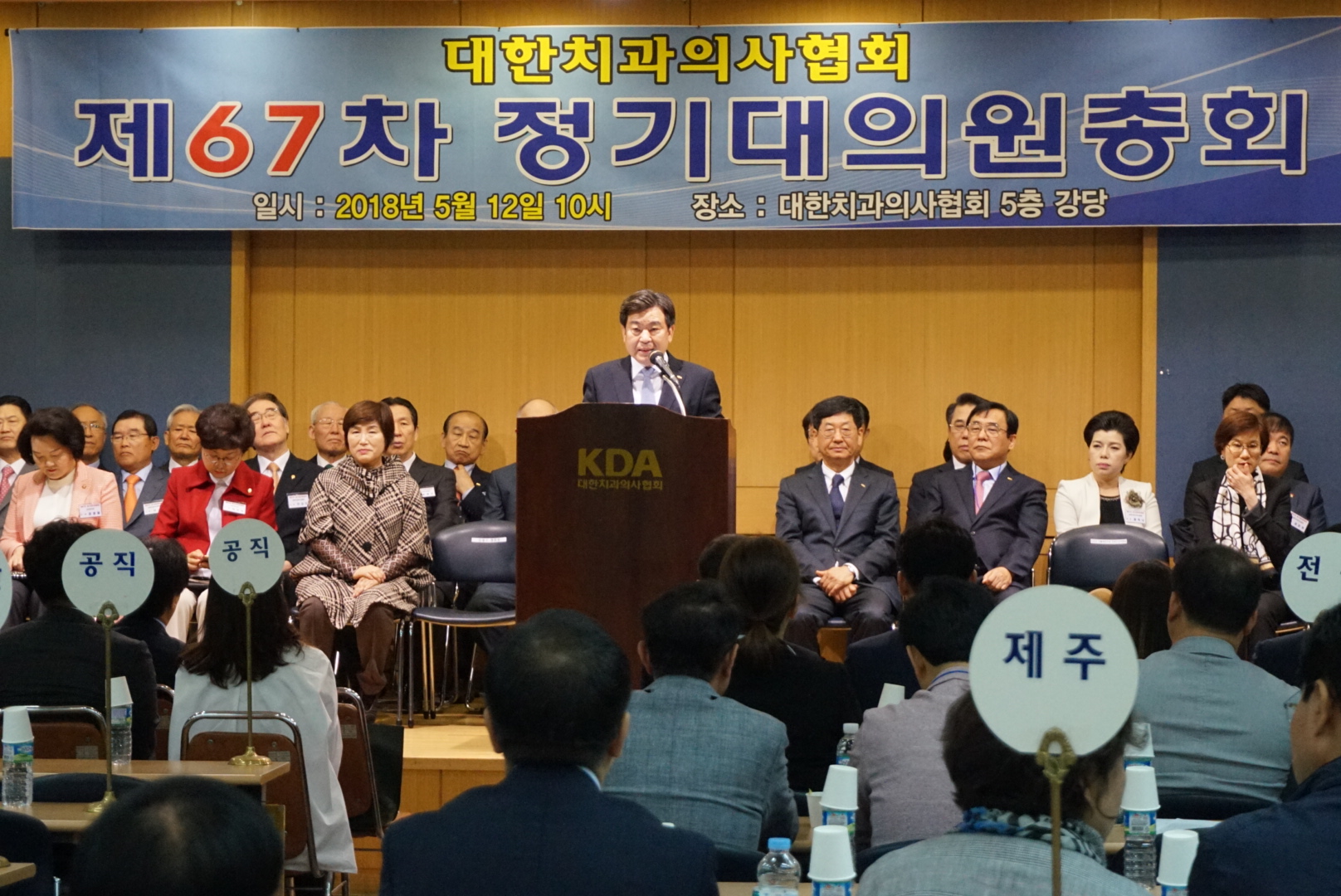 지난 12일 치협회관에서 열린 제67차 정기대의원총회에서 김종환 의장은 "지난해 4월 직선제로 치러진 회장단 선거가 무효로 판결난 뒤 협회장 재선거에 적극 참여해 그동안의 혼란에 종지부를 찍어준 회원들에게 감사를 전한다"며 "내부적으로는 통합치의학과에 대한 헌법소원 제기, 개원가 구인난 해소, 치과대학 정원 감축, 대외적으로는 문재인케어 대응 등 쉽지 않은 과제를 안고 있어 힘과 지혜를 모아 국민과 치과계 모두에게 도움이 되는 정책을 추진해 나가야 할 것"이라고 밝혔다.