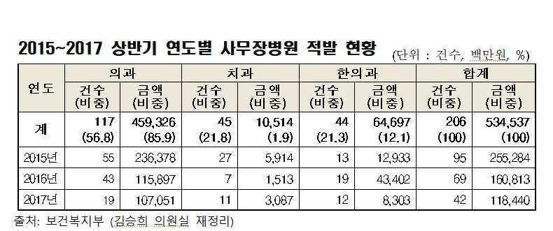 보건복지부 제출자료에 따르면 2015년부터 2017년 상반기까지 적발된 사무장병원이 총 206건으로 나타났으며, 과별로 살펴보면 의과가 117건(56.8%)으로 가장 많았고, 치과병원과 한방병원의 경우 각각 45건(21.8%)과 44건(21.3%) 적발됐다.