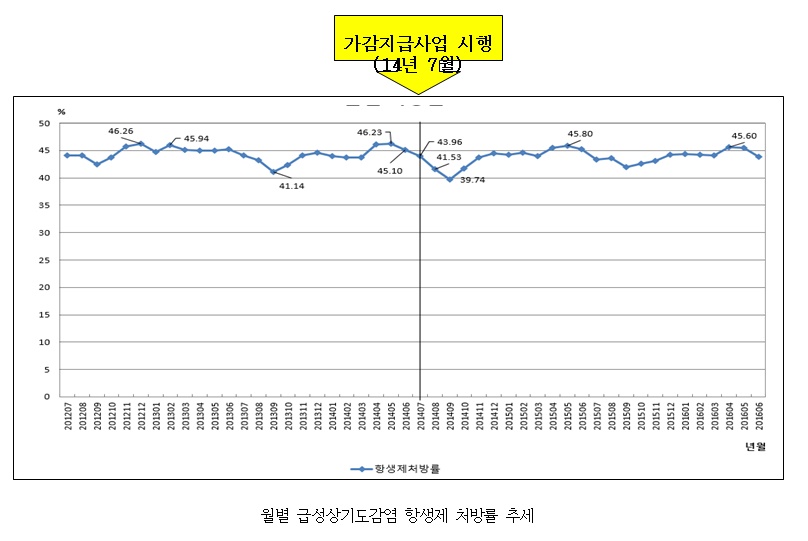 연구 결과에 따르면 2012년 7월부터 2014년 6월까지 월별 항생제 처방률은 평균 약 44.3%로, 2014년 7월 가감지급사업 시행 이후 항생제 처방률은 2014년 9월 39.7%까지 떨어졌지만, 이후 40% 초중반으로 회귀하며 큰 변화가 없었다. 또한 가감지급사업이 현행대로 유지되는 경우 급성상기도감염 항생제 처방률은 2019년 평균 38%로 예측돼 '국가항생제내성관리대책'의 2020년 목표 처방률인 22.1%를 크게 상회할 것으로 분석됐다.