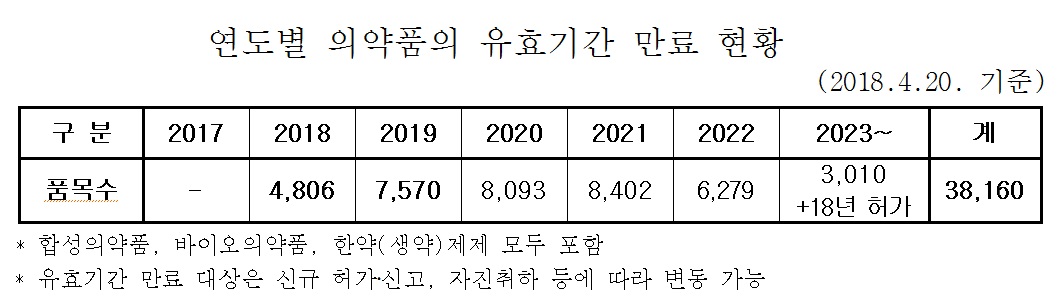 올해 4월 20일 기준으로 갱신해야 하는 품목 2937개 가운데 약 22%(646개)는 최근 5년간 생산‧수입 실적 또는 계획이 없거나 제출자료 미비 등의 사유로 기한 내에 갱신을 신청하지 않은 것으로 판단된다.