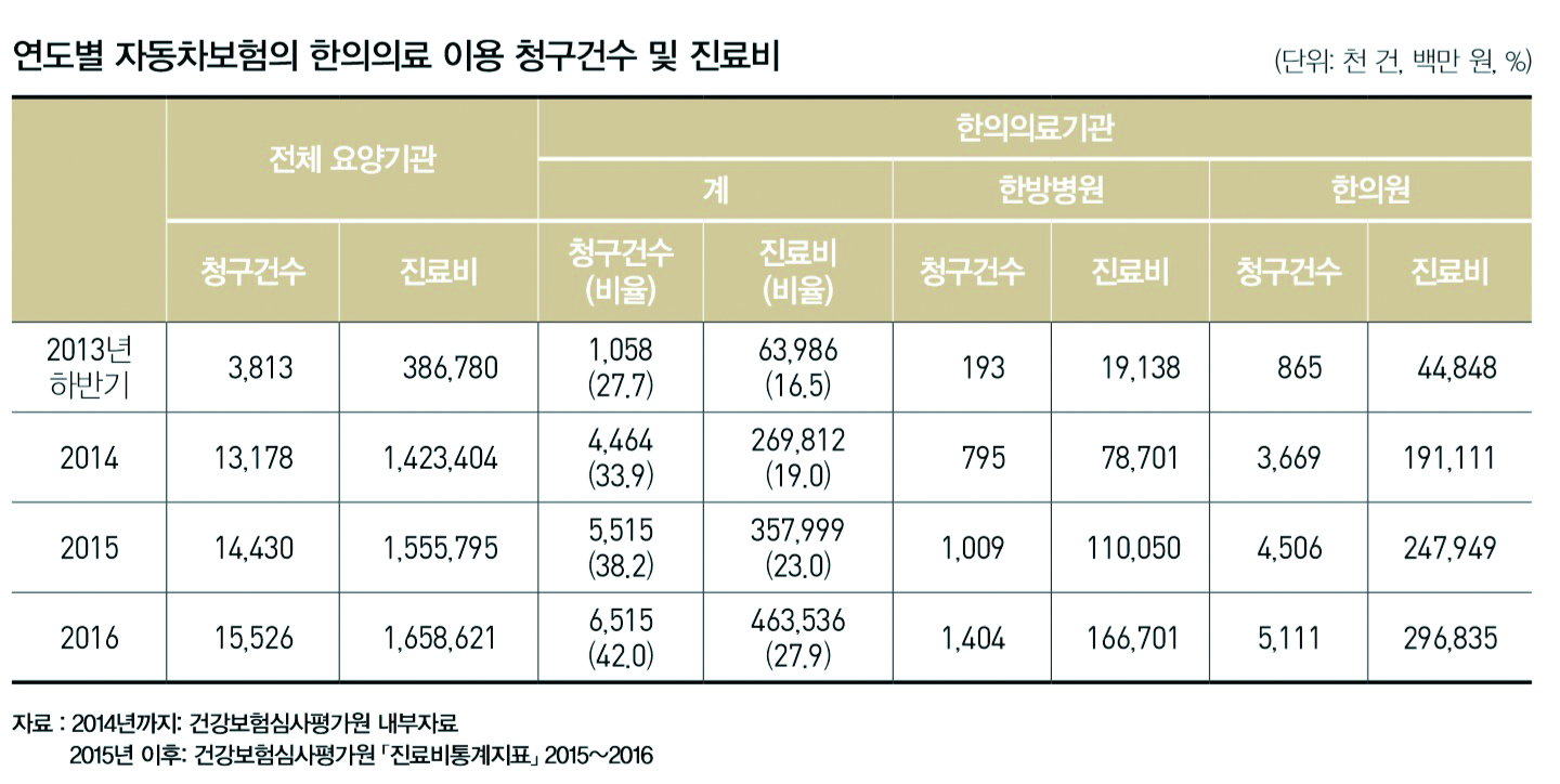 한의의료기관의 자동차보험 진료비는 2016년 약 4635억원으로 2015년 대비 29.5%, 2014년 대비 71.8%가 증가했으며, 이 중 한방병원이 2016년 약 1667억원으로 2015년 대비 51.5%, 2014년 대비 2.1배 증가했고, 한의원은 2016년 약 2968억원으로 2015년 대비 19.7%, 2014년 대비 55.3% 증가한 것으로 분석됐다.