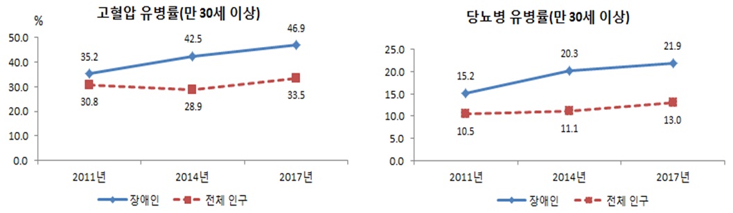 2016년 국민건강영양조사 결과 전체인구의 47.6%가 만성질환을 갖고 있고 평균 0.9개의 만성질환을 보유한 것과 비교해 볼 때 장애인의 만성질환 보유 비율이 상대적으로 매우 높은 수준임을 알 수 있다.