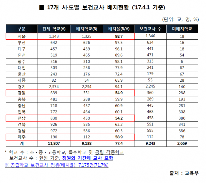 교육부에서 제출한 전국 17개 시·도별 보건교사 배치율 현황(2017년 4월 1일 기준)에서 서울은 보건교사 배치율이 98.7%인 반면 산간벽지가 많은 강원, 전남과 제주의 경우 아직도 보건교사 배치율이 60%에도 미치지 못했다.