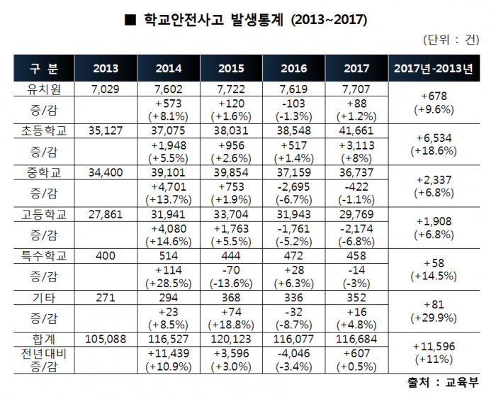 실제 교육부가 박 의원에 제출한 ‘2013년~2017년 학교안전사고 발생 통계’를 살펴보면 학교 내의 안전사고가 지속적으로 증가하는 추세다.