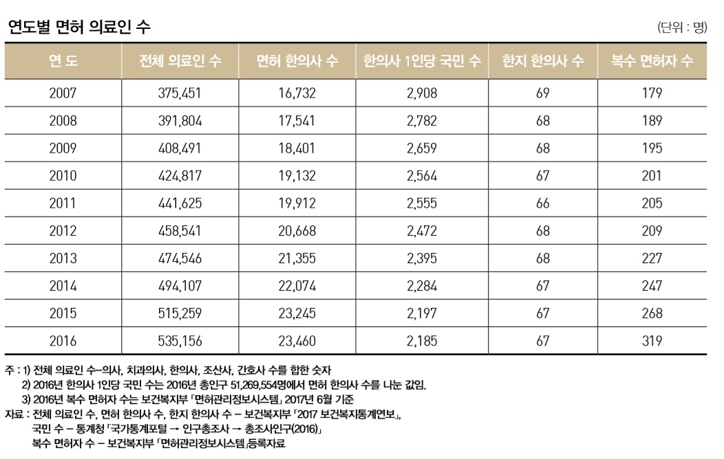 [한의신문=강환웅 기자] 우리나라의 전체 의료인력 수는 2007년 37만5451명에서 매년 평균 1만7745명씩 증가해 2016년에는 53만5156명으로 집계된 가운데 면허 한의사 수는 2007년 1만6732명에서 매년 평균 748명이 증가해 2016년 2만3460명이 됐다. 또한 한·양방 면허를 동시에 갖고 있는 복수면허자수는 2012년 209명에서 2015년까지 매해 평균 20명씩 증가해 268명이 됐으며, 2016년에는 51명이 증가한 319명이었고, 이는 전체 한의사 수 중에서 약 1.4%를 차지하고 있다.