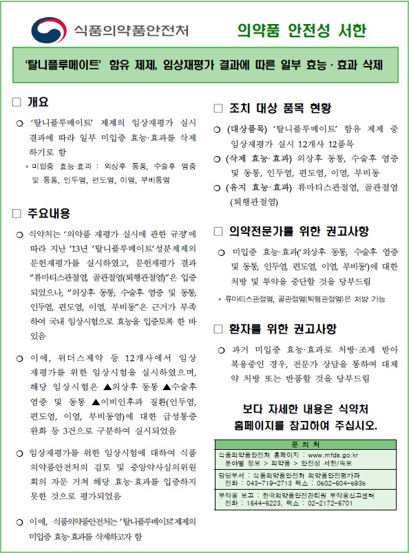 이에따라 ‘탈니플루메이트’ 성분 제제의 효능‧효과 가운데 ‘류마티스관절염, 골관절염(퇴행관절염)’은 허가사항에서 유지되고 ‘수술 후 염증 및 동통, 외상후 동통 인두염‧편도염‧이염‧부비동염’은 허가사항(효능‧효과)에서 삭제된다.