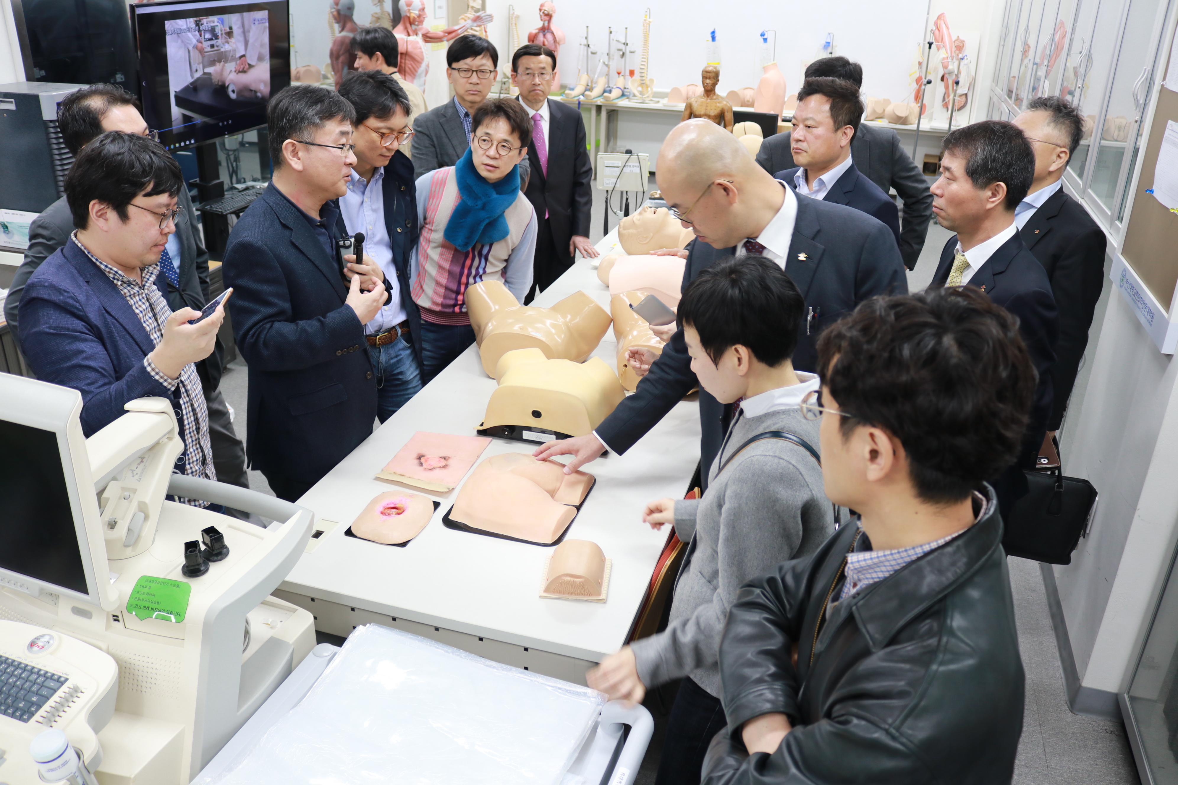 이들은 먼저 1층 술기실습실에 갖춰진 각종 모형 사용 방법에 대한 설명을 들었다. 이 자리에는 청진기 진찰 훈련을 하기 위한 심음・폐음 진찰 모형, 복부 초음파 검사 훈련을 위한 복부 초음파 팬텀, 검이경을 이용한 이경 검사 훈련에 필요한 이경 검사 모형, 질 초음파 검사 훈련을 위한 질 초음파 팬텀, 이물질 기도폐색 및 소아 열성경련 응급처리 훈련을 위한 영아 기본소생실습 마네킹, 농양 배농・화상 및 욕창 드레싱 훈련을 위한 농양 절개 배농술・화상・욕창 드레싱 모형이 구비돼 있었다.