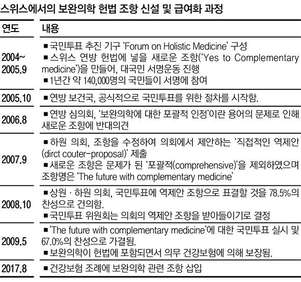 스위스에서는 헌법을 시작으로 보완의학 서비스에 대한 질적 수준 향상과 건강보장 확대를 하나씩 해결해 나간 것이다.