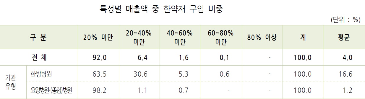 매출액 중 한약재 구입 비중은 평균 16.6%였으며 ‘20% 미만’이 63.5%, ‘20~40% 미만’ 30.6%, ‘40~60% 미만’ 5.3%, ‘60~80% 미만’0.6% 였다.