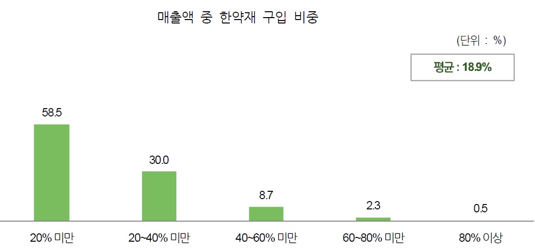 매출액 중 한약재 구입 비중은 평균 18.9%였는데 ‘20% 미만’이 58.5%로 가장 높았고 ‘20~40% 미만’이 30.0%, ‘40~60% 미만’ 8.7%, ‘60~80% 미만’ 2.3%, ‘80% 이상’ 0.5%로 뒤를 이었다.