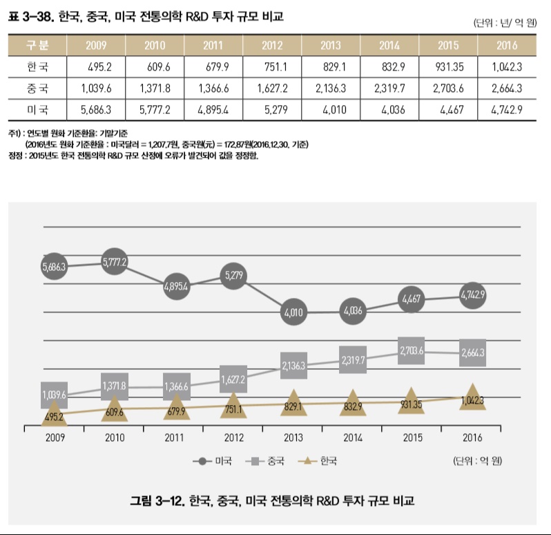정부부처의 한의약 분야 R&D 예산은 2016년 1042억3000만원으로 전년보다 110억9000만원가량 증가했으며, 이는 2016년 정부 R&D 투자예산 약 19조44억원의 약 0.54%, 보건의료 분야 R&D 예산(1조6000억원)의 약 6.51%를 차지하고 있다. 이에 따라 지난 2010년부터 2016년까지 5년간 한의약 분야 R&D 정부투자 연구비는 △2012년 751억1000만원 △2013년 829억1000만원 △2014년 832억 9000만원 △2015년 931억3500만원으로, 연평균 8.5%의 성장률을 보이고 있다.