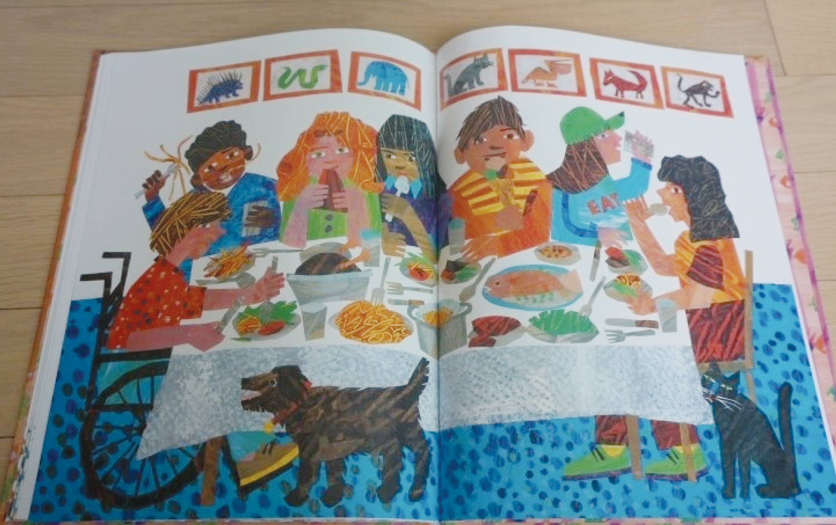 이런 식으로 월요일엔 완두콩, 화요일엔 스파게티. 친구들아 이리와 먹자 하는 노래인데, 이 책을 신나게 읽어주다 맨 마지막에 이 그림을 보고 깜짝 놀랐습니다. 아이들이 식탁에 모여 식사를 하는 장면인데 맨 왼쪽의 아이를 보십시오.