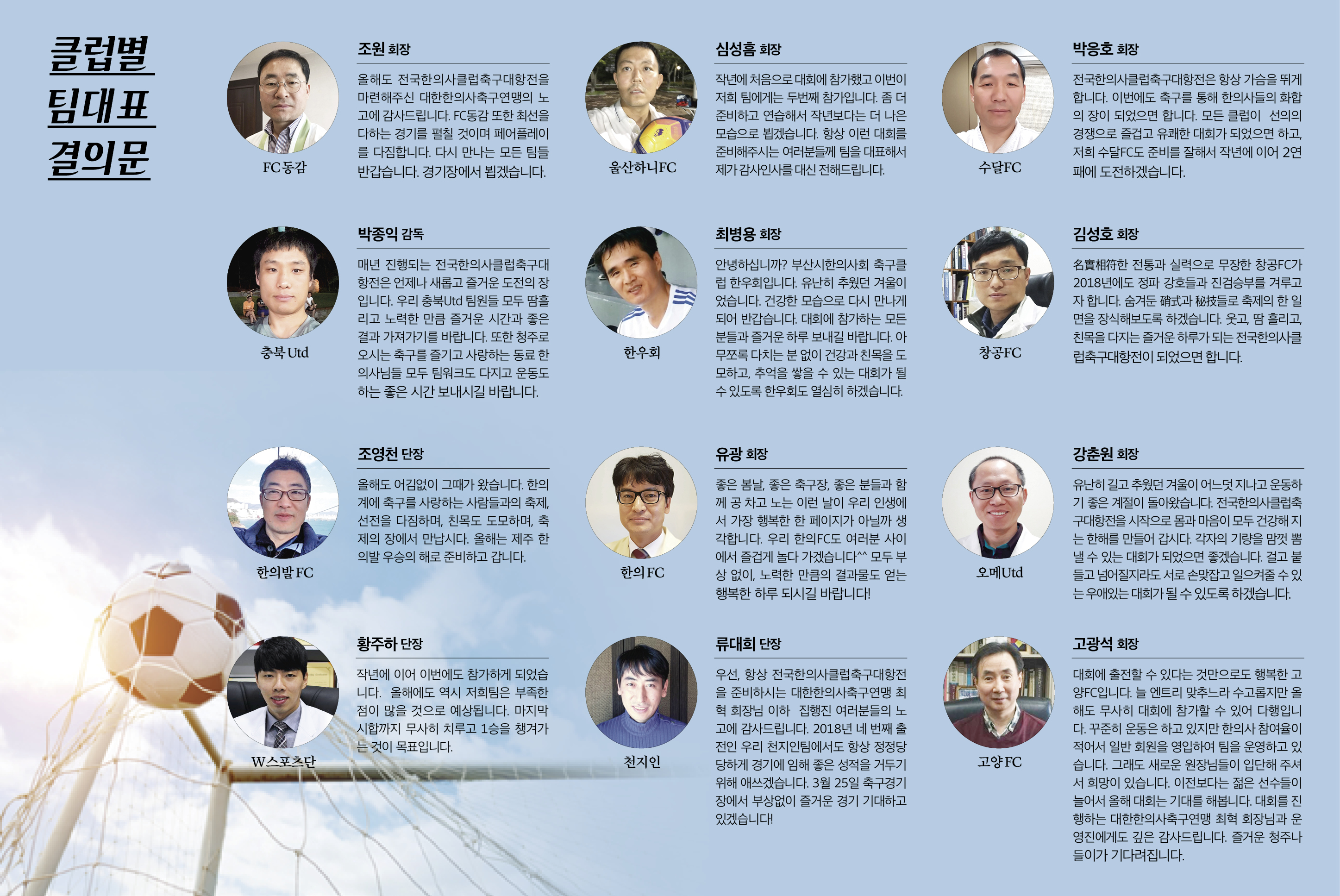 대회는 A조(고양FC, 한의FC, W스포츠단, 오메Utd, 충북Utd, 한의발)와 B조(천지인, 수달FC, 창공FC, 울산하니FC, 한우회, FC동감)로 각각 예선전을 치른 뒤 경기 결과를 통해 각 조의 1~3위팀간 순위결정전을 통해 최종 우승클럽이 결정된다. 선의의 경쟁을 치열하게 펼칠 각 팀 대표선수의 결의문을 들어보았다.