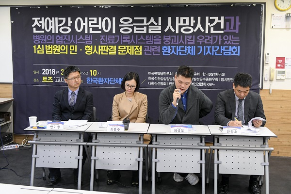 이에 예강이의 유족들과 한국환자단체연합회(이하 환단연)은 14일 교대역 인근에서 '전예강 어린이 응급실 사망사건과 병원의 협진시스템·진료기록시스템을 붕괴시킬 우려가 있는 1심 법원의 민·형사판결 문제점 관련 기자간담회'를 개최했다.