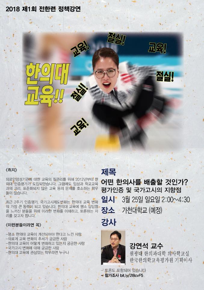 전한련은 "의료인 양성기관에 대한 교육의 질 관리를 위해 2012년부터 한의대 인증평가가 도입됐다. 그럼에도 임상과 학교교육과의 괴리, 표준화되지 않은 교육 등의 문제를 호소하는 학우들이 많다"며 "최근 2주기 인증평가, 국가고시제도 변화는 한의대 교육 변화의 가장 큰 동력이 되고 있다. 이에 한의대 교육에 평소 답답함을 느끼신 분들을 위해 이러한 변화를 이해하고, 토론하는 자리를 갖고자 한다"고 정책강연 개최 배경을 밝혔다.
