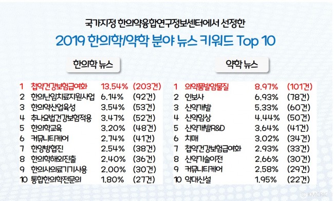 국가지정 한의약융합연구정보센터(센터장 이향숙·이하 KMCRIC)가 2019년 한해 동안 작성된 한의학·약학 뉴스의 키워드를 분석한 2019년 이슈를 정리해 발표한 가운데 한의학 뉴스 중 가장 이슈가 되었던 키워드는 ‘첩약 건강보험 급여화 추진’으로 나타났다.