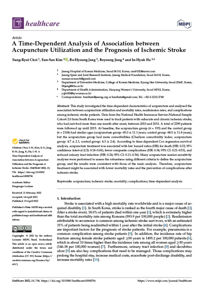 자생한방병원 척추관절연구소(소장 하인혁) 최성률 한의사 연구팀은 허혈성 뇌졸중 환자가 침치료를 받을 경우 사망 및 합병증에 대한 위험이 낮아지는 것으로 나타났다고 9일 밝혔다. 이번 연구 결과는 SCI(E)급 국제학술지 ‘Healthcare (IF=1.58)’ 4월호에 게재됐다.