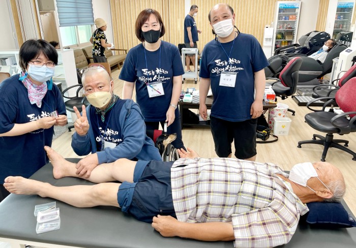 이번에는 남자 삼춘들도 제법 많이 방문하셨다. 지난해 오셨던 해녀삼춘들이 줄을 이어 찾아왔지만 올해는 공동 작업으로 진행되는 보말 채취와 동네 상(喪)이 나는 바람에 예약이 비는 자리가 있었고 그 자리를 남자삼춘들이 차지했다. 남자삼춘들 중에는 손가락이며 발가락이 절단된 사례가 많아 놀랐다. 물어보니 땅콩 농사 등에 사용되는 농기계를 다루다가 사고가 난 것이었다. 당뇨 관리가 되지 않아 엄지발가락을 잃은 남자삼춘도 있었다. 의료시설이 좋았다면 이런 일은 피해갈 수 있었을 것 같아 씁쓸했다. 더불어 여자삼춘들은 바다에서 싸우는 동안 육지에 남아 농사를 돌봤을 남자삼춘들의 삶도 만만찮았음을 느낄 수 있었다. 그 어디인들, 그 누구인들 삶이 녹록하겠는가. 고단하고 눈물겨운 인생을 온 몸이 대신 말하고 있는 듯 했다. 남자삼춘들에게 봉사단의 진료시간이 잠시 쉬어가는 휴식이 되었기를 바라는 마음이다.