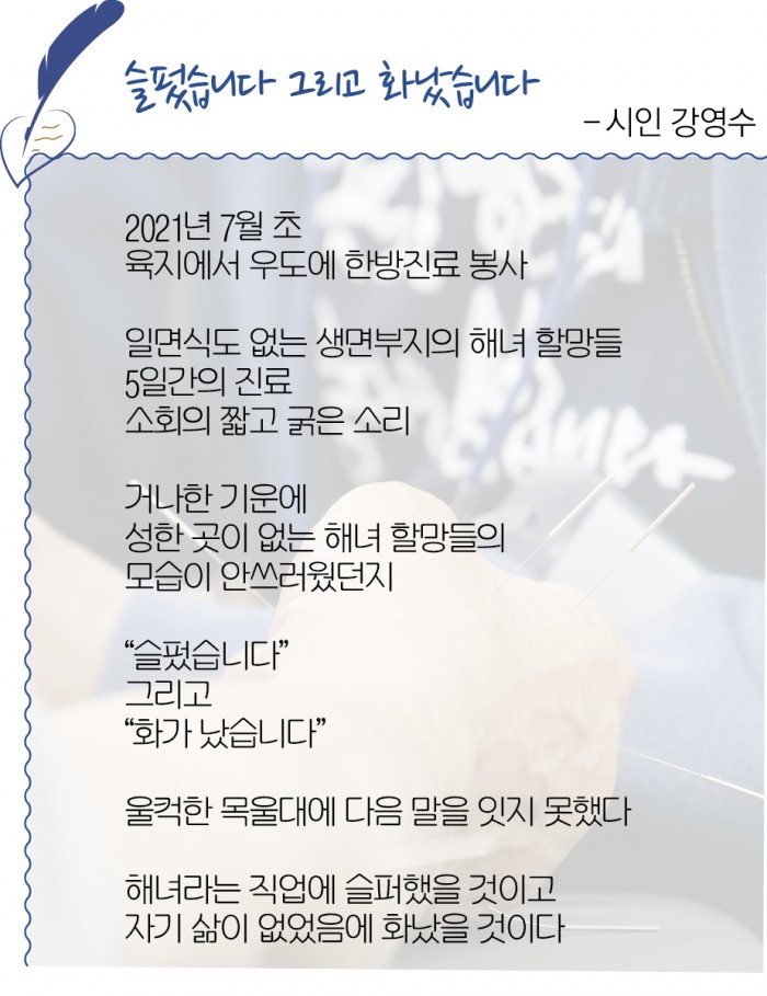 작년 2021년 우도 의료봉사 마지막 날 저녁에 동네 분들과 저녁을 먹으며 소감을 말하다 울컥했었다. 평생을 아프셨다는 증상들이 며칠 침 맞고 좋아지시는 것을 보고 마냥 좋지만은 않았기 때문이다. 그 자리 계셨던 마을 주민 강영수 시인께서 올해 낸 ‘해녀의 기도’라는시집 속에 그 이야기를 담으셨다.