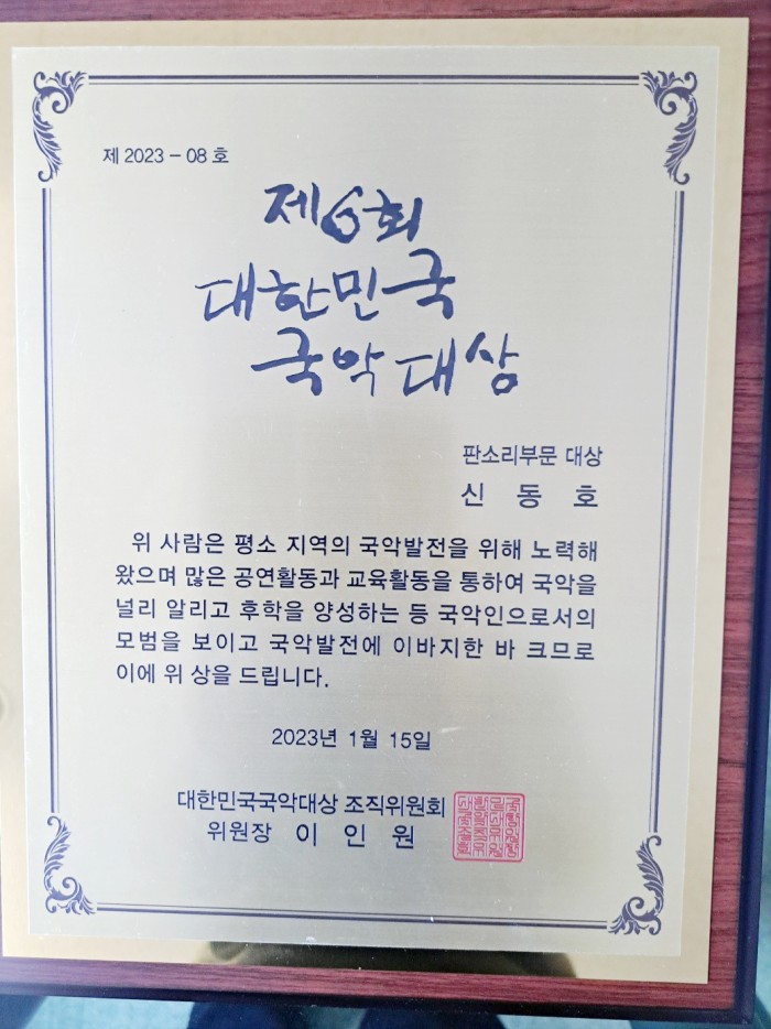 전라남도한의사회 사무국장, 유달풍물패 단장, 사단법인국악협회 이사, 하늘소리 대표 등을 맡아 활동하며, 각종 대회 및 봉사활동, 버스킹 등 눈코 뜰 새 없이 바쁜 일상을 보내고 있는 신동호 국장은 얼마 전 제6회 대한민국 국악대상에서 판소리부문 대상을 차지하면서 자신의 커리어에 15번째 수상이력을 새겼다.
