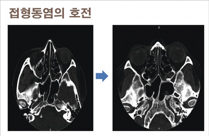 환자의 치료가 종료되는 시점인 한달 후 2월17일 경과 확인을 위해 다시 촬영을 진행했다. 가장 심했던 우측 상악동만 조금 남은채 접형동까지 모두 호전된 모습을 확인할 수 있었다.