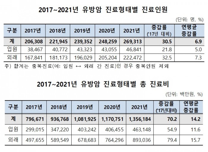 국민건강보험공단(이사장 직무대리 현재룡)은 건강보험 진료데이터를 활용, ‘17년부터 ‘21년까지 유방암 환자의 건강보험 진료현황을 발표했다. 유방암은 유방에 생긴 암 세포로 이뤄진 종괴로, 일반적으로 유방의 유관과 소엽에서 발생한 암을 일컫는다.