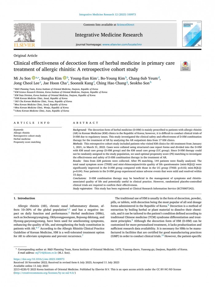 한국한의학연구원(원장 이진용·이하 한의학연) 손미주 박사 연구팀이 한의의료기관에서 알레르기 비염의 치료로 많이 활용하는 첩약의 치료 효과를 확인했다고 밝혔다. 이번 연구성과는 국제전문학술지 ‘Integrative Medicine Research(통합의학연구, IF 3.4)’에 ‘Clinical effectiveness of decoction form herbal medicine in primary care treatment of allergic rhinitis: A retrospective cohort study’라는 제하로 게재됐다.