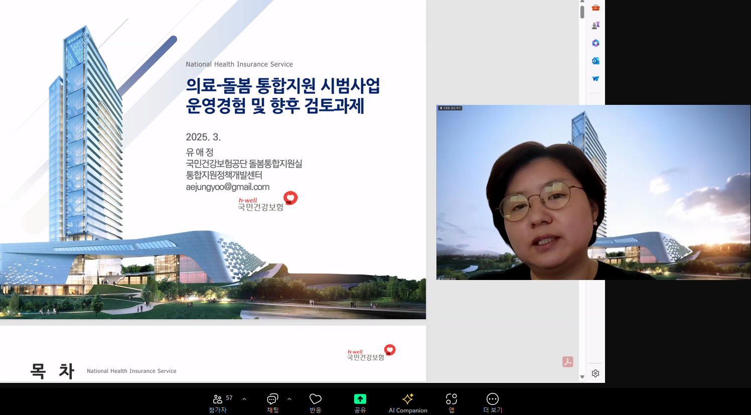 유애정 센터장에 따르면 정부는 어르신들이 살던 곳에서 건강한 노후를 보낼 수 있도록 지역사회의 다양한 기관에서 제공되는 보건의료, 장기요양, 돌봄, 복지서비스를 연계해 노인들의 욕구에 맞는 서비스를 통합적으로 제공하기 위해 지난 2023년 7월부터 장기요양재 재가급여자 등을 대상으로, 지자체(예산지원형 12개소, 기술지원형 35개소)가 참여하는 ‘의료·돌봄 통합지원 시범사업’을 실시했다.