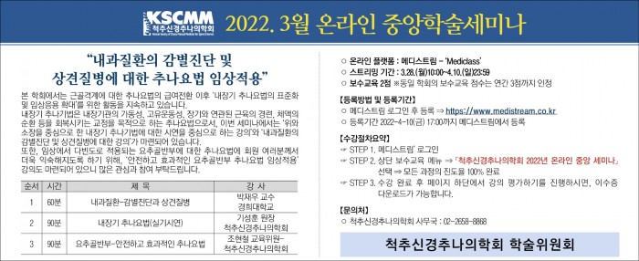 22/3/28~4/10 척추신경추나의학회 온라인 중앙학술세미나 페이지 정보 작성자 한의신문 작성일22-04-01 10:44 조회3,196회 댓글0건 관련링크 이전글 다음글 목록 본문 댓글목록 등록된 댓글이 없습니다. 이전글 다음글 목록