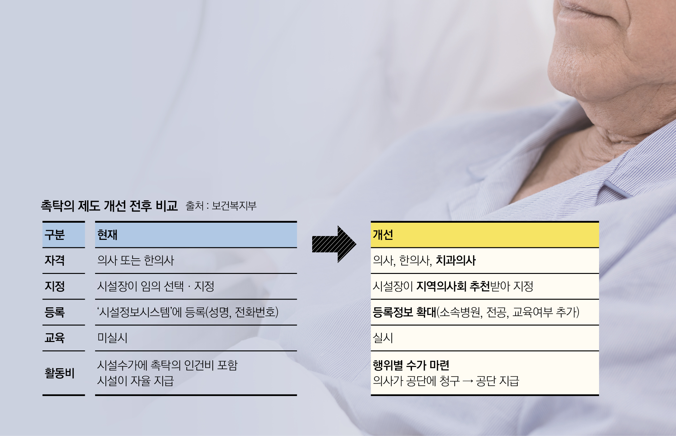 촉탁의 지정 방식도 바뀐다. 전에는 요양시설의 장이 임의로 지정했으나 앞으로는 시설장이 각 직역(한의사, 의사, 치과의사)별 지부에 추천을 요청해 지정할 수 있게 된다.