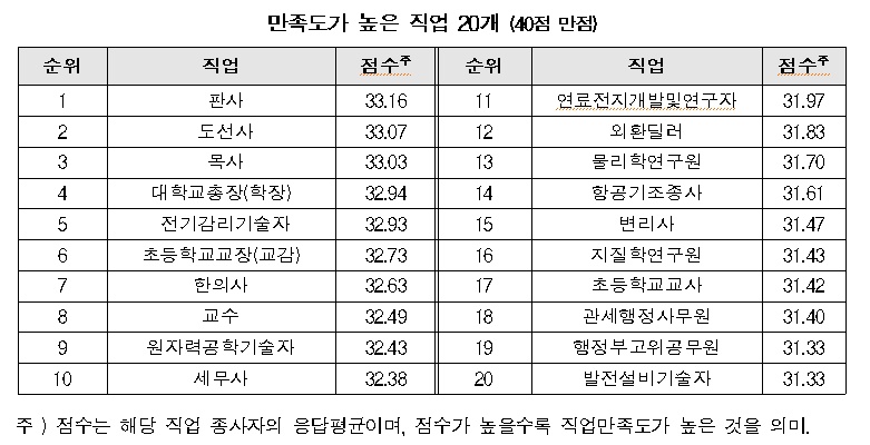 이에 따르면 만족도가 가장 높은 직업으로는 판사로 나타났으며, 도선사·목사·대학교 총장(학장)·전기감리기술자·초등학교 교장(교감)·한의사·교수·원자력공학기술사·세무사 등의 순으로 나타났다.