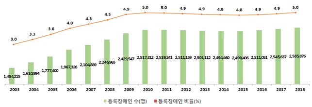 전체 인구 대비 5.0%가 등록장애인65세 이상 노년층 등록장애인 증가 추세 지속 복지부, 2018년도 등록장애인 현황 발표 [한의신문=김대영 기자] 보건복지부(장관 박능후)는 2018년 등록장애인의 연령별·장애유형별․성별․등급별 등 주요 지표별 '2018년도 등록장애인 현황'을 발표했다. 2018년 말 기준 등록장애인은 258만 6000명(전체 인구 대비 5.0%)으로 나타났다. 70대(57만 3000명, 22.2%), 60대(57만 1000명, 22.1%)에서 등록장애인 수가 가장 많으며 9세 이하(2만 9000명, 1.1%), 10대(6만 1000명, 2.3%)에서 가장 적었다. 성별로는 남성 등록장애인의 비율(150만 명, 57.9%)이 여성(109만 명, 42.1%)보다 높았다. 15개 장애유형을 분석한 결과 지체장애(123만 9000명, 47.9%)가 가장 많았고 청각(34만 2000명, 13.2%), 뇌병변·시각(각 25만 3000명, 9.8%) 순으로 비율이 높았으며 가장 낮은 유형은 뇌전증(7,000명, 0.3%), 심장(5,000명, 0.2%), 안면장애(3,000명, 0.1%)였다. 등급별 분포를 보면 1∼3급 등록장애인은 99만 명(38.0%), 4∼6급 등록장애인은 160만 명(62.0%)이다. 지역별로는 경기도 등록장애인 수가 54만 7000명(21.2%)으로 가장 많았으며, 세종이 1만 1000명(0.4%)으로 가장 적은 것으로 나타났다. 등록장애인 수 및 전체 인구 대비 비율은 등록장애인에 대한 서비스의 확대, 등록제도에 대한 인식 개선으로 2003년 이후 꾸준히 증가했으나 2010년부터는 전체 인구 대비 5% 정도로 비슷한 수준을 유지하고 있다. 인구 고령화에 따라 65세 이상 노년층 장애인 수가 지속 증가(’11년 38.0%→’14년 41.4%→‘16년 43.4%)하고 있어 장애인구의 고령화가 상당한 수준으로 진행된 것으로 보인다. 노년층 장애인 중 가장 많은 장애유형은 지체(49.7%), 청각(20.9%), 뇌병변(11.6%), 시각(10.5%), 신장(2.7%) 순으로 나타났다. 지체장애(’09년 53.2%→‘18년 47.9%)는 2010년 이후 감소추세인 반면 발달장애(‘09년 6.9%→‘18년 9.0%), 신장장애(‘09년 2.2%→‘18년 3.4%)는 증가추세를 보이고 있다. 1∼3급 장애인에 비해 4∼6급 장애인의 비율이 2003년 이후 지속적으로 높은 추세를 유지하고 있다. 보건복지부 권병기 장애인정책과장은 “매년 등록장애인의 추이 분석을 통해 장애인의 특성에 맞는 적절한 복지서비스가 제공될 수 있도록 할 예정”이라고 말했다. -