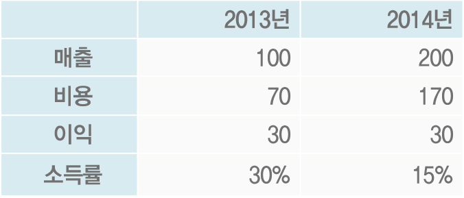 예를 들어 상기표에서처럼 작년보다 매출이 늘어났음에도 불구하고 소득률이 떨어지거나 매출에 비해 소득률이 지나치게 낮은 경우 국세청에서 반갑지 않은 편지나 손님이 올 가능성이 높아진다.
