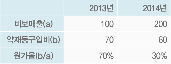 상기표에서 2013년의 원가율이 70%인 반면 2014년 원가율이 30%로 원가율이 작년에 비해서 지나치게 급감하고 있다. 또한 2013년 원가율이 지나치게 높다는 것을 알 수 있다. 이는 기말재고를 잘못 측정한 결과 이런 데이터가 나올수도 있는데 문제는 이런 숫자가 나오면 국세청의 세무조사 대상에 선정되기 쉬우니 잘못된 회계처리나 재고관리로 원가율이 이상하게 나오지 않는지 꼭 체크하자.