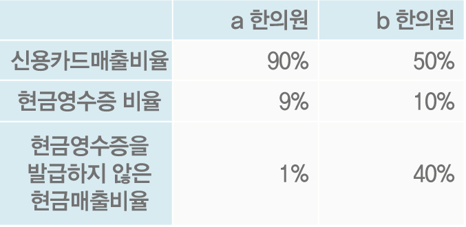 예를 들어 상기표를 보면 a 한의원의 경우 현금매출이 지나치게 낮아서 현금매출누락을 의심받을 수 있다. 반면 b 한의원은 현금매출비율이 높아서 현금영수증 미발급을 의심 받을 수 있으니 매출관리시 우리 한의원의 현금매출이 지나치게 높거나 낮지 않은지 체크해보자.