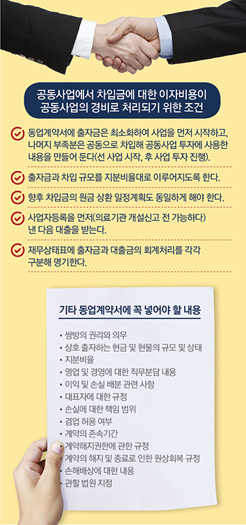 즉 동업계약서에 출자금을 각각 500만원 정도의 적은 금액으로 명기해놓고 나머지 필요한 자금은 의료기관 개설 신고 전에 미리 사업자등록증부터 발급받은 후에 은행에서 대출받아 사용하는 것이 대출금에 대한 이자비용에 대한 과세당국과의 마찰을 줄일 수 있다.
