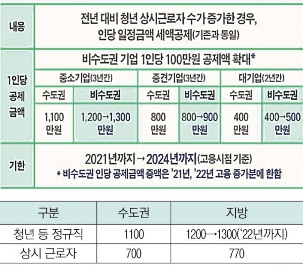청년 등 직원 1명당 수도권 기준 1100만원의 세액공제, 청년 외 직원도 700만원의 세액공제가 가능하다. 수도권 외에 위치한 경우에는 청년 등 직원 1명당 1300만원(‘22년 증가분까지), 청년 외 직원은 770만원의 세액공제가 가능하다.